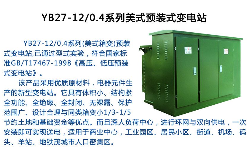 YB27-12/0.4預(yù)裝式變電站是產(chǎn)化美式箱變。該產(chǎn)品作為電纜化配電網(wǎng)中重要的供電單元,集高壓控制、保護(hù)、變電、以及配電設(shè)備于一體的成套預(yù)裝產(chǎn)品,廣泛應(yīng)用于城鄉(xiāng)配電網(wǎng)之中。